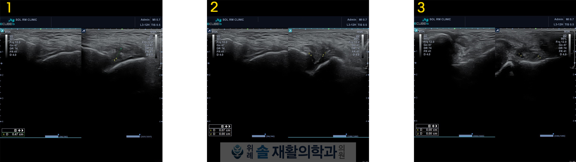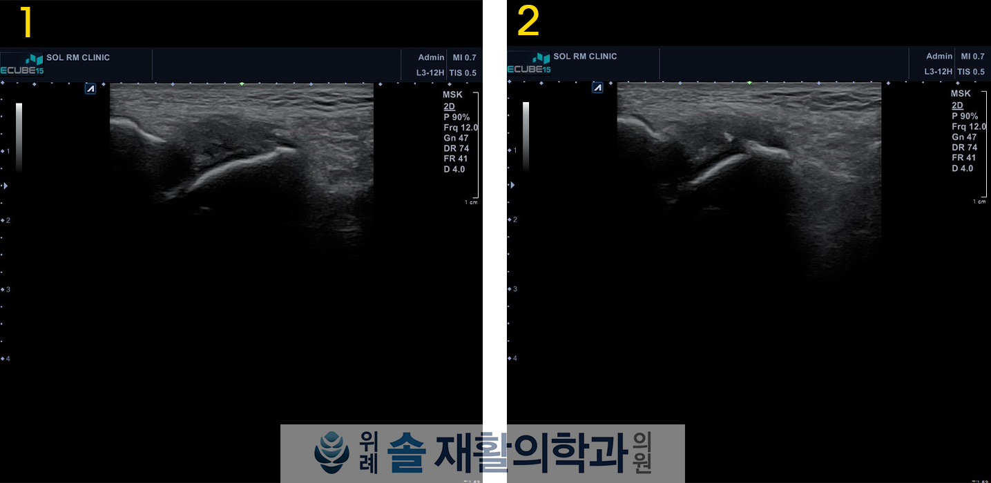 주사치료와 체외충격파치료를 각각 3회씩 시행하였으며, 이 후 통증은 많이 가라앉아 6주 후 초음파검사를 재시행 해보았더니, 기존의 발목 인대 파열 부위에 새살이 돋아 매꿔져있음을 확인할 수 있었습니다.