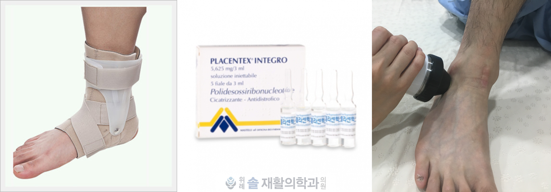 CASE의 환자는 이미 2주가 지나서 불안정성이 확인된 상태로 왔기 때문에, 내원 시점에서 반깁스 고정까지는 필요하지 않았고 손상된 인대를 회복시키는 것이 급선무여서, 조직재생주사(DNA주사)치료와 체외충격파치료를 통하여 인대의 재생을 유도하고 발목 보조기를 착용하여 발목에 무리가 가지 않도록 보호하였습니다.